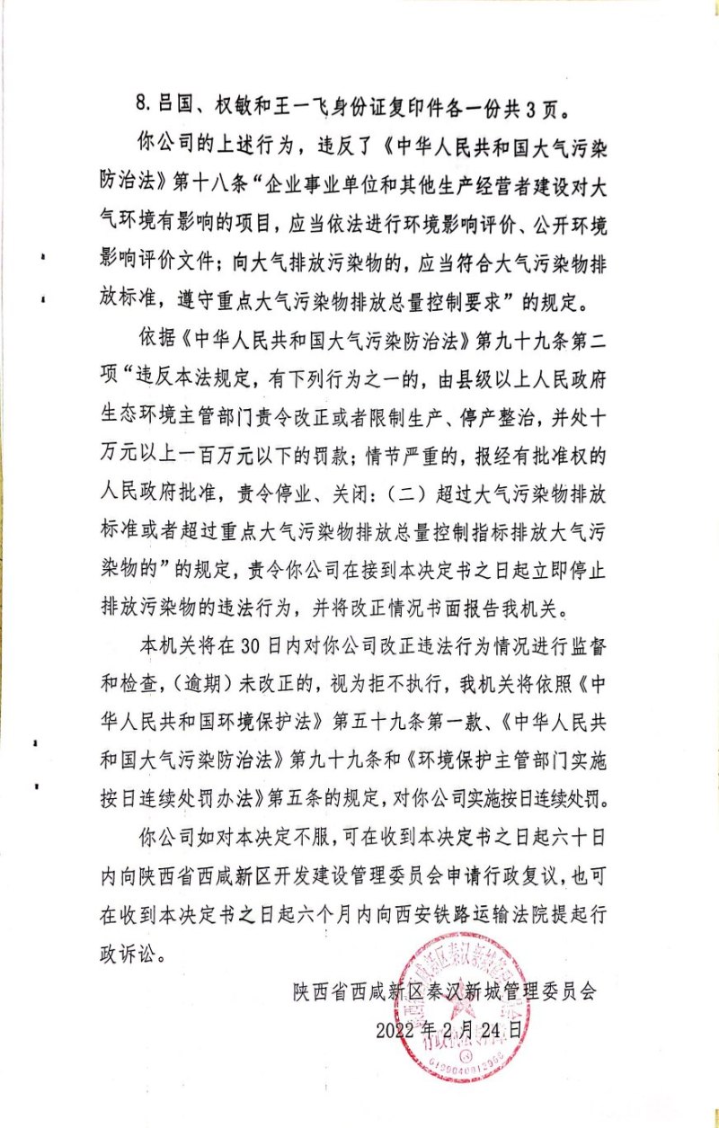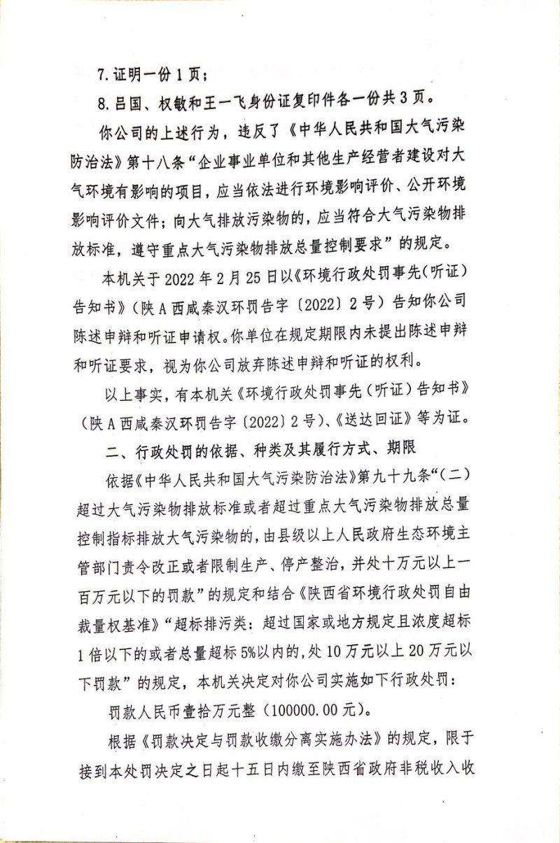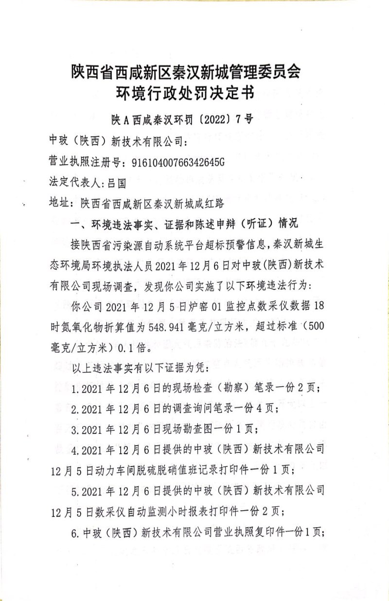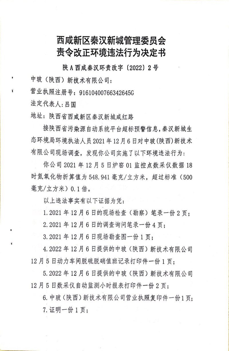 中玻(陕西)新技术有限公司环境行政处罚决定书和责令改正环境违法行为决定书