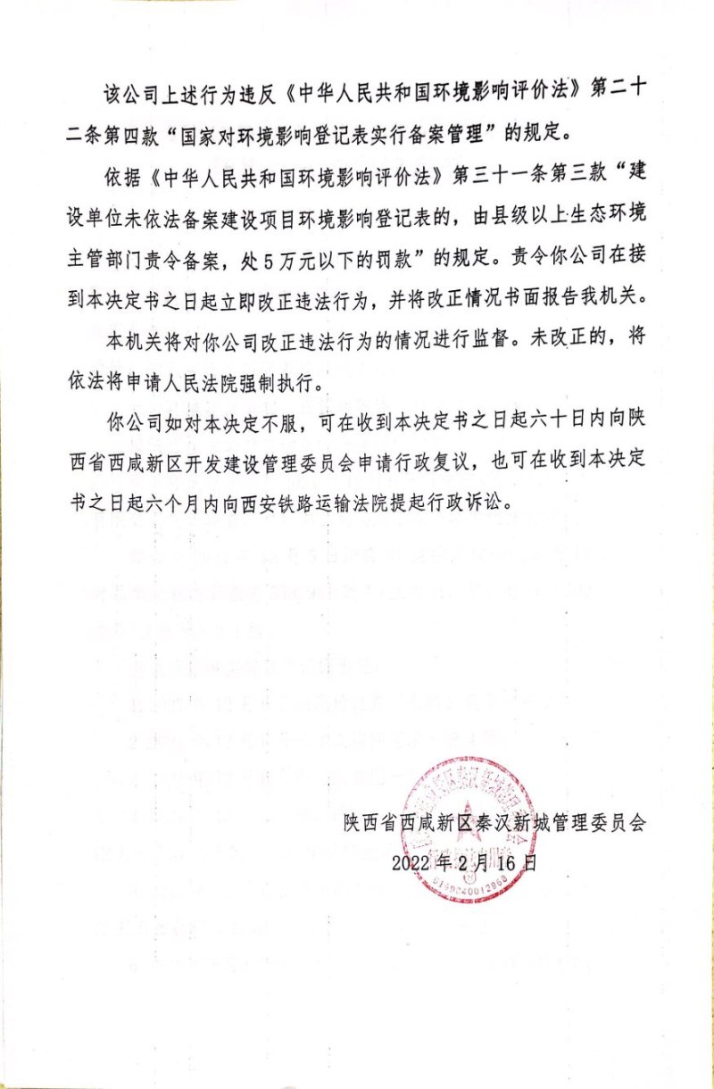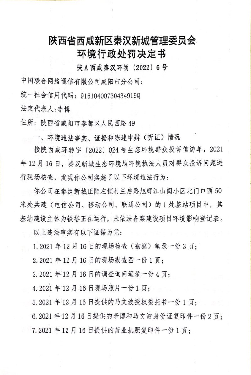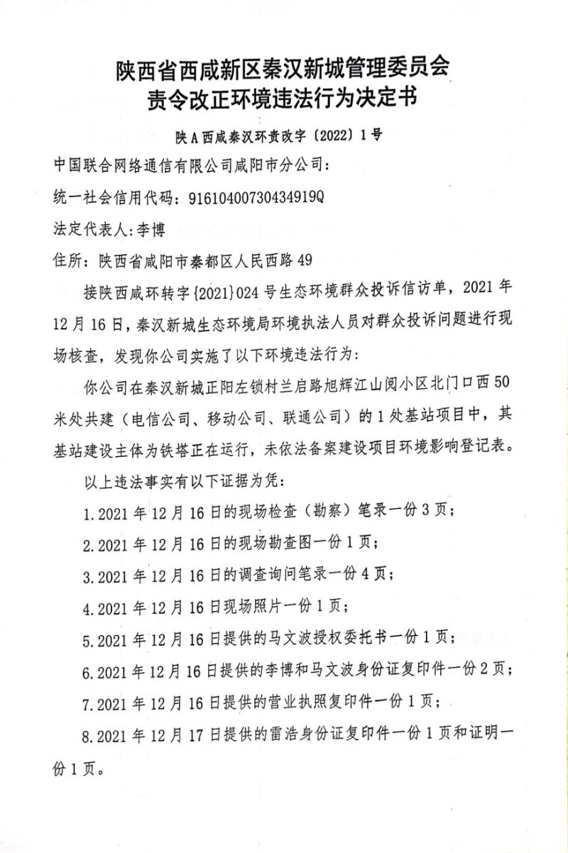 中国联合网络通信有限公司咸阳市分公司环境行政处罚决定书和责令改正环境违法行为决定书