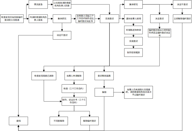 3 | 对存在不及时消除可能严重威胁公共安全火灾隐患的场所或者部位的临时查封 | 《中华人民共和国消防法》第五十四条消防救援机构在消防监督检查中发现火灾隐患的,应当通知有关单位或者个人立即采取措施消除隐患;不及时消除隐患可能严重威胁公共安全的,消防救援机构应当依照规定对危险部位或者场所采取临时查封措施。 《消防监督检查规定》(公安部令第120号)第二十二条消防救援机构在消防监督检查中发现火灾隐患,应当通知有关单位或者个人立即采取措施消除;对具有下列情形之一,不及时消除可能严重威胁公共安全的,应当对危险部位或者场所予以临时查封: (一)疏散通道、安全出口数量不足或者严重堵塞,已不具备安全疏散条件的; (二)建筑消防设施严重损坏,不再具备防火灭火功能的; (三)人员密集场所违反消防安全规定,使用、储存易燃易爆危险品的; (四)公众聚集场所违反消防技术标准,采用易燃、可燃材料装修,可能导致重大人员伤亡的; (五)其他可能严重威胁公共安全的火灾隐患。 临时查封期限不得超过三十日。临时查封期限届满后,当事人仍未消除火灾隐患的,消防救援机构可以再次依法予以临时查封。 | 消防救援大队 | 查封期限不超过30日 | 行政复议、行政诉讼 | 行政复议—收到决定书之日起60日内;行政诉讼—收到决定书之日起6个月内 | |