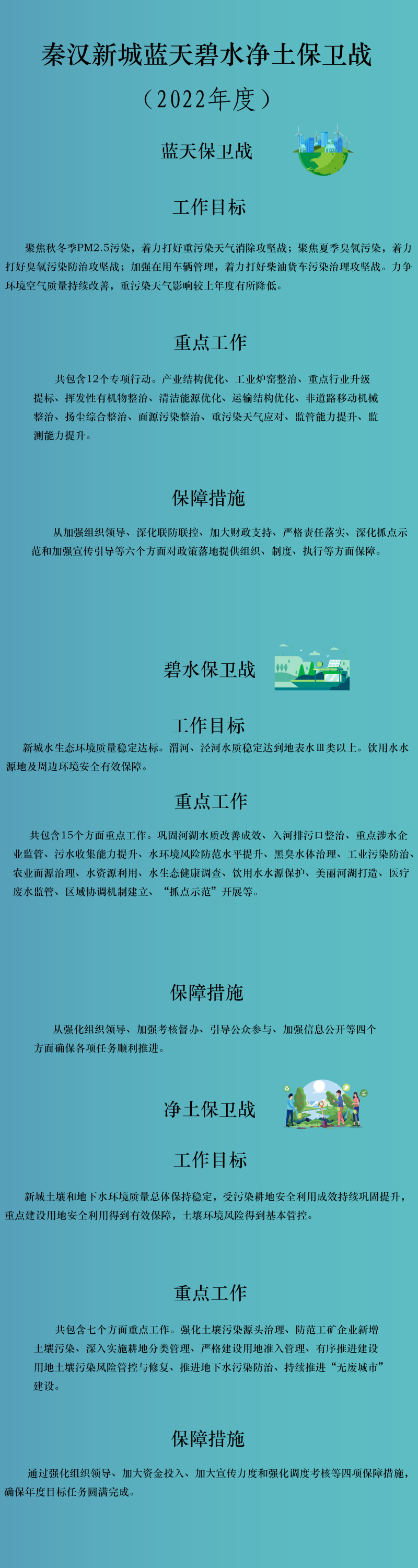该方案由三个子方案组成,分别是蓝天保卫战工作实施方案、碧水保卫战工作实施方案、净土保卫战工作实施方案,每个子方案均由工作目标、重点工作和保障措施三部分构成。一、秦汉新城蓝天保卫战2022年工作实施方案(一)工作目标聚焦秋冬季PM2.5污染,着力打好重污染天气消除攻坚战;二、秦汉新城碧水保卫战2022年工作实施方案(一)工作目标新城水生态环境质量稳定达标。 |